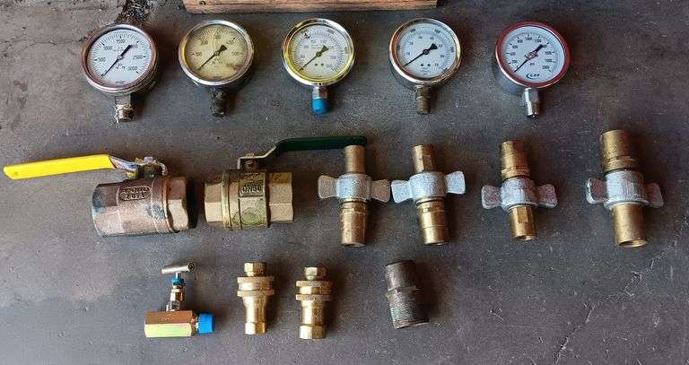 5) Pressure Gauges, 4 Hydraulic Quick Couplings, 2 Hydrolic Disconnect Couplings, 2) 2" Brass Ball Valves & 1 Needle Valve