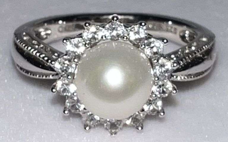 LOT 495 - Sterling Silver Pearl & White Sapphire Dinner Ring
